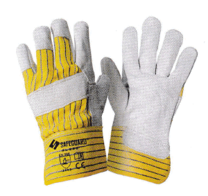 Cowsplit leather palm and wing thumb, natural white cotton back, PE cuff, palm lined.